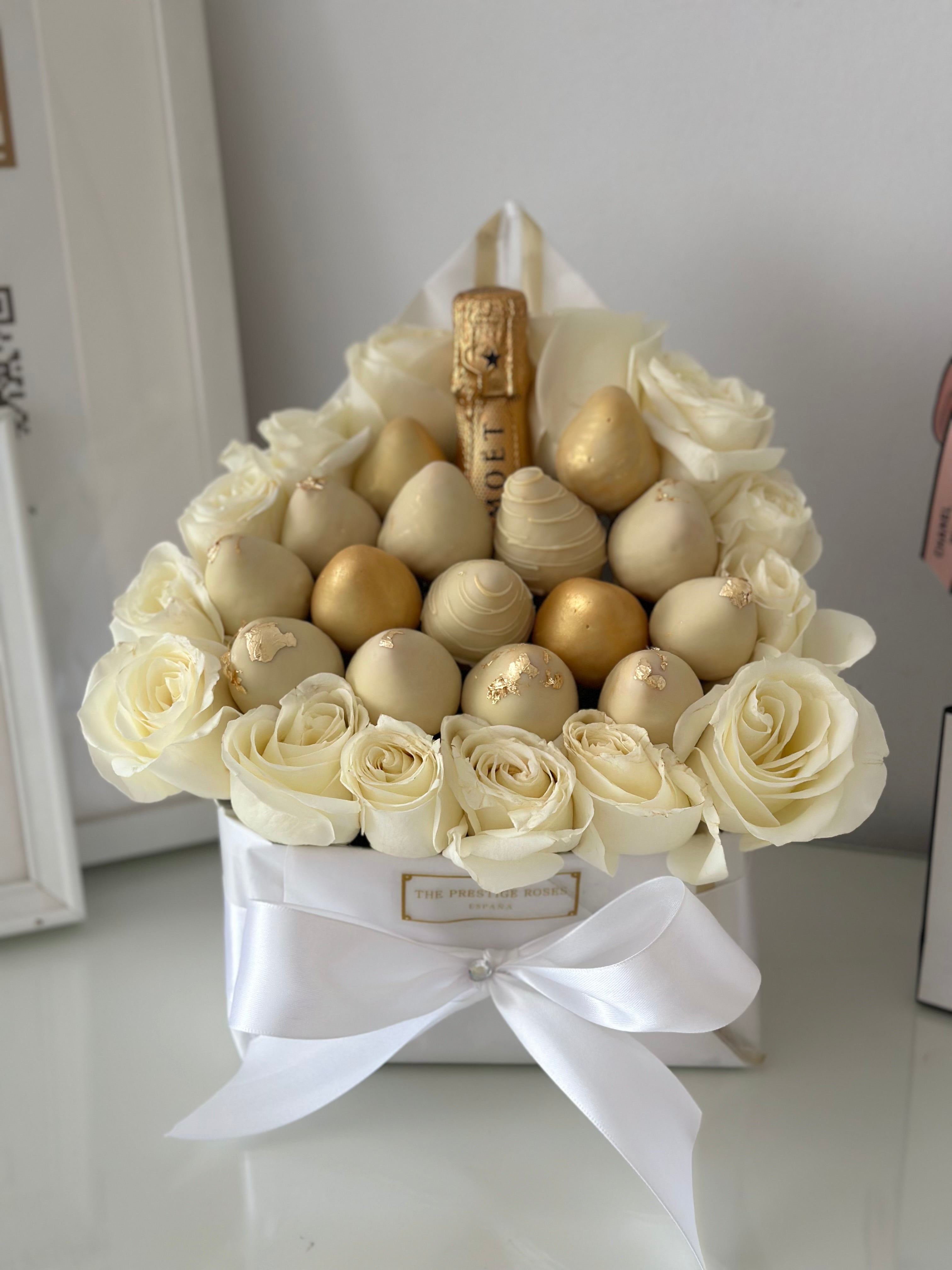 Crea momentos inolvidables con nuestras fresas bañadas en chocolate, rosas frescas y champán de lujo