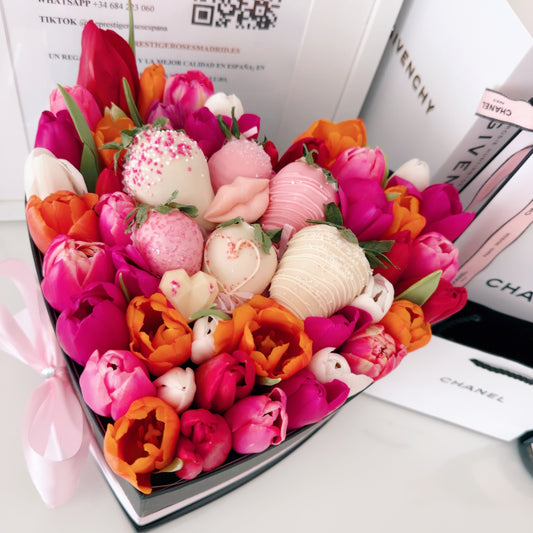 Caja de Tulipanes Frescas con Fresas cubiertas con chocolate