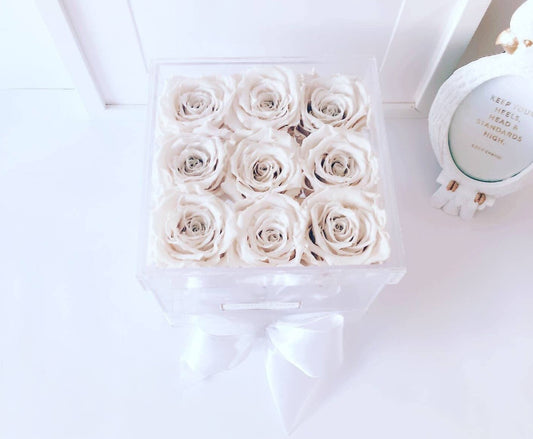 Caja Acrílica con Rosas Eternas Blancas – Regalo Elegante en Madrid