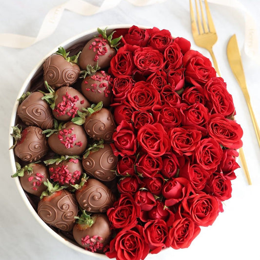 Caja de Rosas Frescas con Fresas bañadas en chocolate