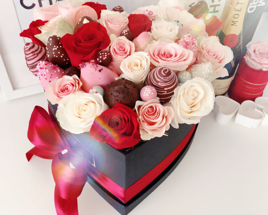Caja de Rosas Frescas con Fresas cubiertas con chocolate