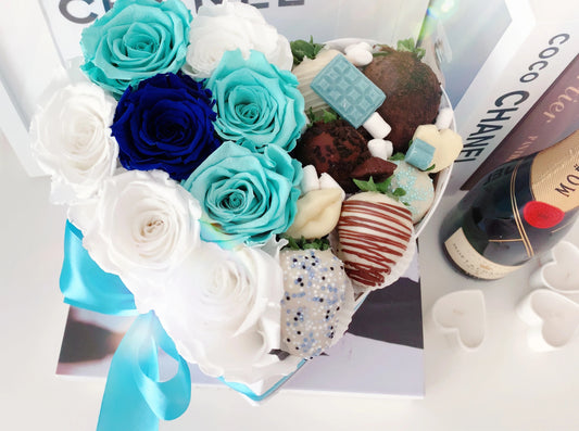Colección Caja corazon de Fresas banadas en Chocolate y rosas frescas y champagne