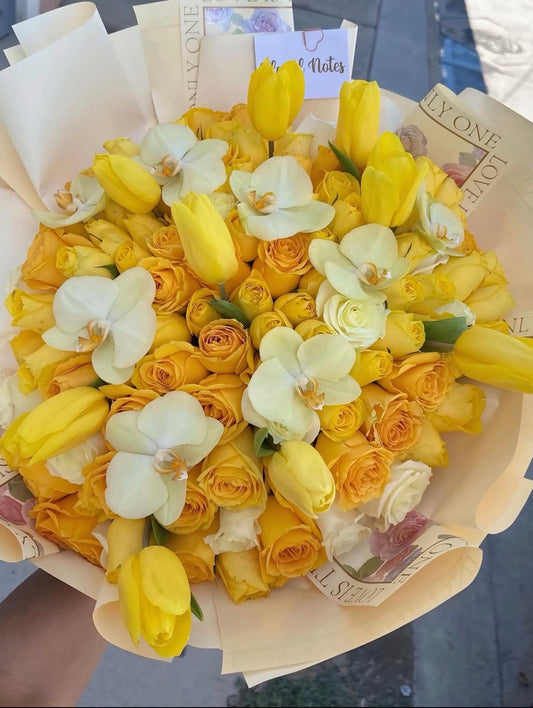 Golden Elegance – Bouquet de Rosas Amarillas, tulipanes y Orquídeas