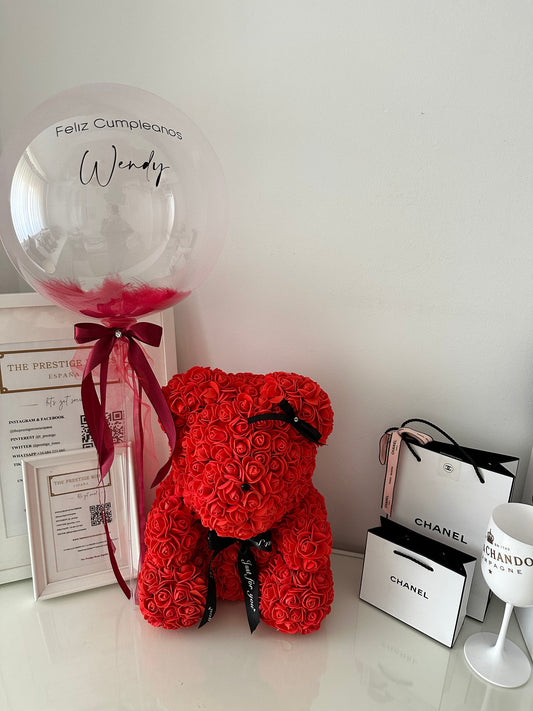 Set de regalo con Oso de rosas, globo personalizado, embalaje y fresas bañadas en chocolate