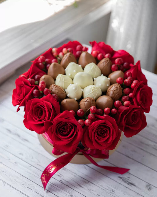 Caja de Rosas Frescas con Fresas bañadas en chocolate