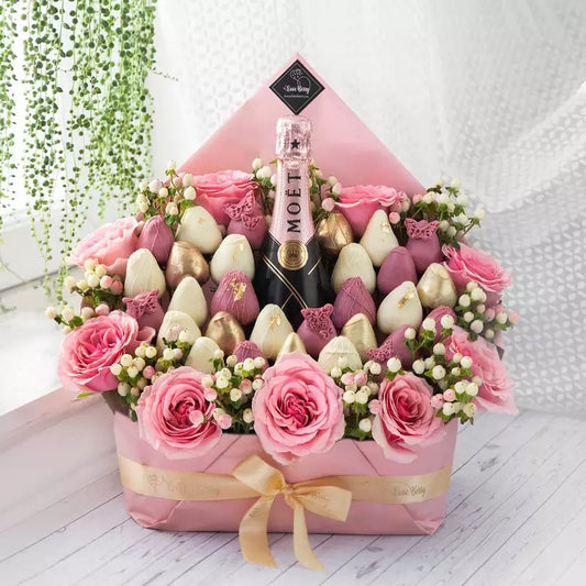 Bouquet con fresas bañadas en chocolate y flores frescas y Moet