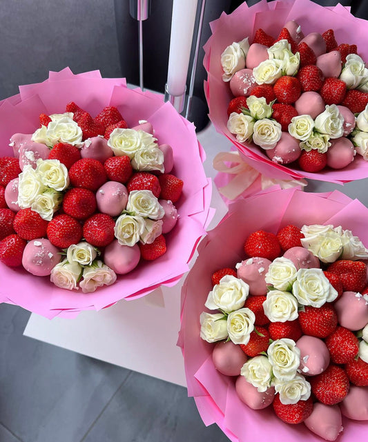 Ramo de fresas bañadas en chocolate y flores frescas