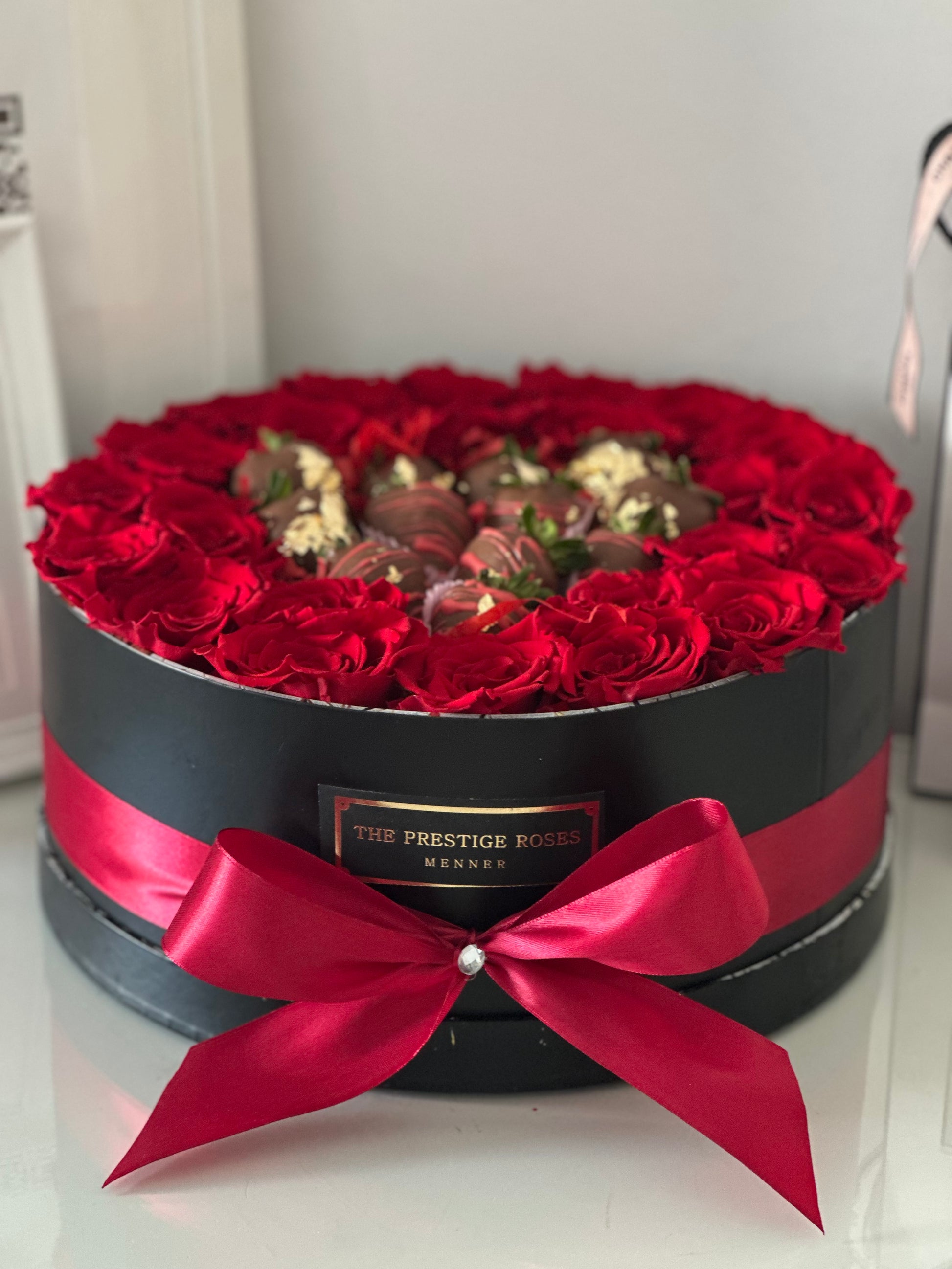 Descubre la Caja de Rosas y Fresas de Chocolate, un regalo único y exclusivo diseñado para sorprender y enamorar en cualquier ocasión especial. Este lujoso arreglo combina la elegancia de las rosas frescas o eternas con el toque gourmet de un corazón de fresas bañadas en chocolate artesanal, decoradas con detalles de oro comestible y fresas.