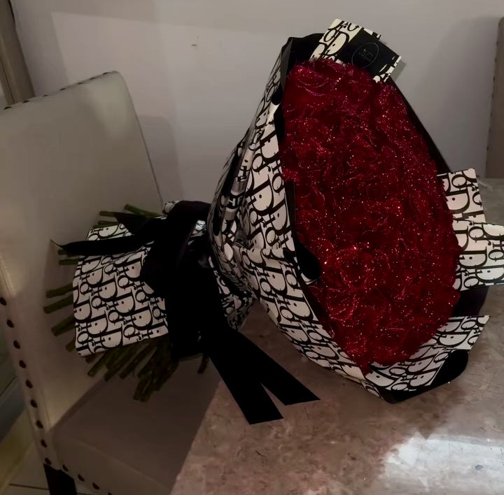 El encanto clásico de un ramo de rosas nunca pasa de moda. Nuestras rosas, vibrantes, son un símbolo perfecto de pasión y placer. El arreglo destacado es el tamaño "¡Lujo!", un elegante ramo de rosas frescas naturales brillantes ligeramente perfumadas que capturan la esencia del amor y la sofisticación.